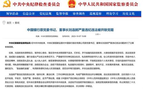 10月7日,根據中央紀委國家監委網站消息,對中國銀行股份有限公司原黨委書記董事長劉連舸涉嫌嚴重違法違紀問題,經過中共中央批準,中國紀委國家監委對其進行立案審查調查,經調查后獲悉,劉連舸喪失了理想和信念,背棄了黨員的初心使命,在落實中央決策部署方面打折扣不堅決,大肆插手信貸項目,違法違規給企業發放貸款造成巨大的金融風險,無視中央八項規定精神,違規收受他人禮品禮金,利用職務之便在他人貸款,融資與項目合作等方面謀取巨額利益。