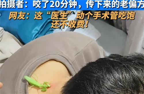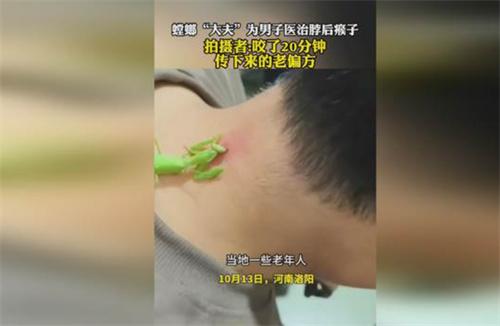 北京時間10月13日下午,一則令人匪夷所思的治療方法在網上瘋傳。據了解,河南洛陽一名男子決定嘗試用螳螂來治療他的頸后瘊子,而這種治療方法也迅速引起了人們的廣泛關注與討論。