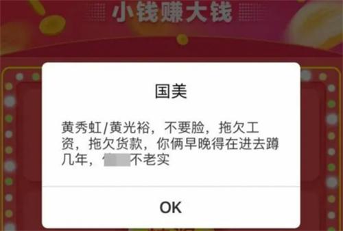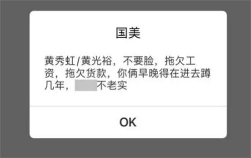 10月14日上午,有網(wǎng)友在國美客戶端當(dāng)中發(fā)現(xiàn),竟然有彈窗辱罵黃秀虹和黃光裕,辱罵的內(nèi)容是不滿國美拖欠工資和拖欠貨款,據(jù)了解黃光裕是國美集團(tuán)的創(chuàng)始人,黃秀虹是黃光裕的妹妹,9月25日,黃秀虹退任國美零售董事的職位,不過從當(dāng)前的商報消息來看,她目前仍舊是國美電器的董事長。
