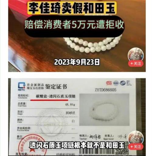據了解,在此前李佳琦曾經在直播間賣過鴛鴦金樓的一款和田玉項鏈,李佳琦在售賣這款和田玉項鏈時,表示這款和錢玉項鏈是經過了鑒定的。在買到手之后還附有鑒定書,有一位消費者在李佳琦直播間購買了這款和田玉項鏈,消費者在拿到這款和田玉項鏈之后,也立刻在國家珠寶玉石檢驗集團有限公司對這款和田玉項鏈進行了驗證。但是國家珠寶玉石檢驗集團有限公司,對這款和田玉項鏈經過鑒定,之后的結果卻顯示這款和田玉項鏈的質地為碳酸鹽透閃石,消費者在收到這一鑒定結果之后,也立刻向商家就此事進行了反映,這家店鋪的運營負責人為了息事寧人則直接給消費者轉了5萬元,消費者在看到對方的轉賬之后,直接將對方的轉賬給拒收了。