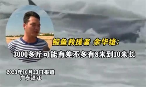 近日廣東湛江一頭鯨魚在海灘上面擱淺,當地市民合力把鯨魚救回大海的視頻引起了人們的關注,這頭鯨魚已經獲救,據了解,這頭鯨魚差不多有3000多斤,體長大概8米到10米。