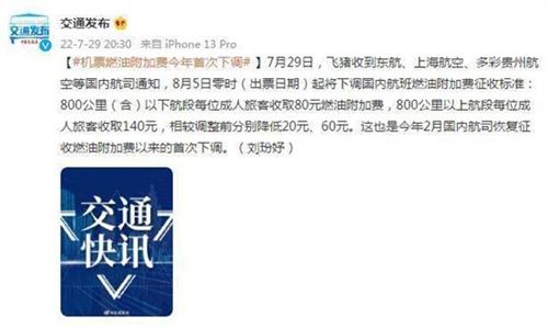 去哪兒接到的航空公司消息顯示,從2023年開(kāi)始,成人旅客在乘坐航班時(shí),每800公里需要花費(fèi)60元燃油附加費(fèi),對(duì)800公里以上航線的旅客,每人收取110元燃油附加費(fèi)。冬天馬上到來(lái),人們的出行需求也會(huì)逐漸下降,相信航空公司的燃油收費(fèi)標(biāo)準(zhǔn)下調(diào),也會(huì)滿足市場(chǎng)需求,帶來(lái)穩(wěn)定增長(zhǎng)。飛機(jī)燃油附加費(fèi)是 航運(yùn)公司根據(jù)燃料價(jià)格變化設(shè)置的一項(xiàng)附加費(fèi)用,主要是彌補(bǔ)燃油成本。