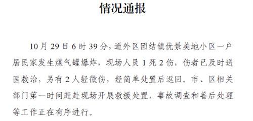 根據媒體最新報道10月29日6:39,哈爾濱道外區團結鎮優景美地小區有一戶居民家里面發生了煤氣罐爆炸事件。該場爆炸導致現場人員1死兩傷,受傷的患者已經及時送到醫院救治,還有兩人出現輕微受傷,經過簡單處置之后已經返回家中,市區相關部門在爆炸事件發生的第一時間就已經趕赴到了現場開展救援處置,該事故的調查包括善后處理工作目前正在有序處理中。