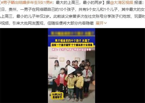 10月28日,最新報道,貴州一男子在社交網絡上曬出自己家的10個孩子,9個女孩一個男孩最小的孩子才2歲。該男子在視頻中表示9個女兒沒有一個輟學,最大的大女兒目前正在上高三,最小的兒子才兩歲,該視頻發布之后也引發了網友的熱烈討論。