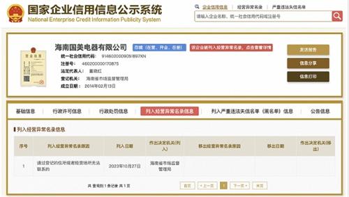 海南國美電器有限公司10月27日,在國家企業信用信息公示系統網站顯示,由于登記的住所或者經營場所沒有辦法取得聯系而被列入經營異常名錄。國美電器海南公司成立的時間是2014年2月,董曉紅是法定代表人,注冊資本為人民幣2,000萬,經營范圍包括家用電器銷售,食品經營,出版物零售,酒類經營和新能源汽車整車銷售等,國美零售有限公司是其全資持股的股東。