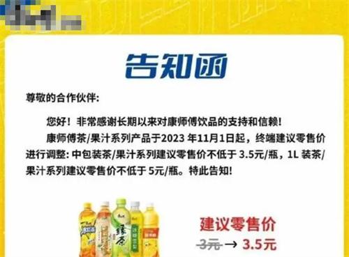 11月2日,網(wǎng)傳康師傅飲料投資有限公司旗下杭州頂津食品有限公司發(fā)出通告,該通告指出,康師傅茶和果汁系列產(chǎn)品將會在2023年11月1日開始對建議零售價進行調(diào)整。其中包裝茶和果汁系列的飲品建議零售價從3元每瓶調(diào)整到不低于3.5元每瓶,一升包裝的茶飲和果汁系列的飲品,建議零售價從4元每瓶調(diào)整到5元每瓶。