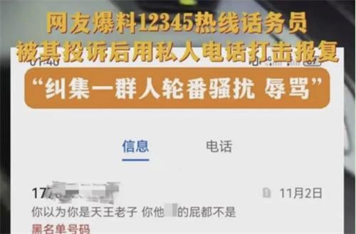 有媒體報道,根據陜西咸陽市網友反饋12315市民熱線話務員被投訴后疑似對方集多人用私人電話辱罵。有知情人士對記者表示的確有這件事情,已經接到上級單位的反饋,涉事的話務員正在接受調查,咸陽市委網信辦的工作人員表示關注了這件事情正在處理中。據這位網友表示自己在致電12345市民熱線咨詢問題辦理進展的時候,借錢的話務員態度特別差,之后就將這位話務員投訴,這名網友稱投訴當天晚上,話務員使用多個私人手機進行輪番的騷擾辱罵。