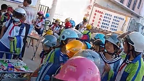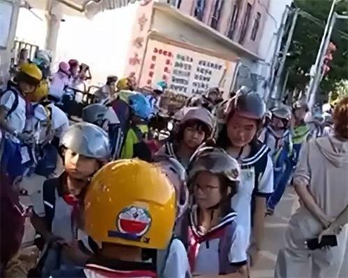 通過(guò)網(wǎng)上所傳的視頻和照片可以看出。在角尾鄉(xiāng)中心小學(xué)校門口,學(xué)生們陸陸續(xù)續(xù)的走進(jìn)走出校門都戴著頭盔。視頻中有幾十名學(xué)生在走路時(shí)都戴著頭盔,只有一名學(xué)生沒(méi)帶頭盔,但是頭盔拿在手上,但是視頻中卻并沒(méi)有看到自行車摩托車或者是電動(dòng)車出現(xiàn)。