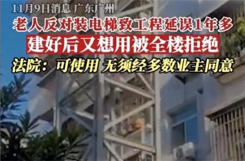 廣州某小區(qū)業(yè)主建議加裝電梯,但是老人反對安裝,卻在建好之后想要使用,這引起了其他業(yè)主的反對。事件發(fā)生時間是2017年至2018年,廣東廣州荔灣區(qū)某小區(qū)某棟9層住宅樓業(yè)主建議加裝電梯,其中44戶業(yè)主有32戶同意,但居住在3樓年近8旬的郭某因為有意義,所以沒有參與出資,當電梯使用之后郭某希望在補交相應集資款之后使用該電梯,但是其他的業(yè)主反對郭某使用電梯。