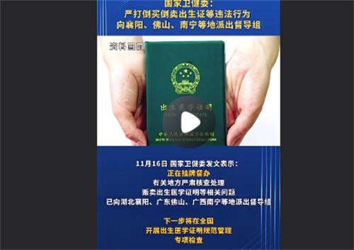 11月17日,記者也從國家衛(wèi)生健康委獲得最新消息,國家衛(wèi)生健康委目前已經(jīng)掛牌督辦了有關(guān)地方,將會嚴肅核查處理販賣出生醫(yī)學證明等相關(guān)問題。國家衛(wèi)生健康委已經(jīng)向廣東佛山、廣西南寧、湖北襄陽等地派出督導組將會指導地方政府深挖徹查,也將會及時回應(yīng)社會關(guān)切到的問題,將會根據(jù)掌握的線索追究相關(guān)部門的責任。