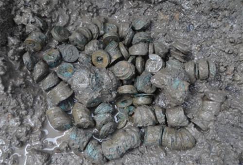所發(fā)現(xiàn)的六朝時期的一部當(dāng)中,最為重要的是水井群和銅錢窖藏坑。在銅錢窖藏坑當(dāng)中出土了796枚銅錢,這些錢主要是五株錢,有東漢時期的5銖錢,也有西漢時期的五銖錢,還有少量的磨郭5株錢、剪輪,和少部分的貨泉,半兩,大泉五十和布泉。一共發(fā)現(xiàn)了6口水井,包括陶圈井,土坑井,淘圈和磚井組合井以及磚井。同時還有大量的建筑材料,包括獸面紋瓦當(dāng)?shù)龋约疤掌鳌⒅押屯氲却善鳌4u井當(dāng)中還出土了,1682枚土鐵錢。