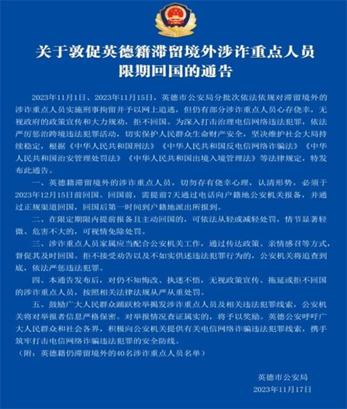 英德市公安局對外所發(fā)布的公告上還明確表示,直到目前為止,總共有40名涉嫌詐騙的英德人滯留在境外沒有回國,奉勸這40名涉嫌詐騙的英德人員,不要心存僥幸的心理,也必須認清,當前的具體形式必須在規(guī)定的時間內(nèi)返回國內(nèi)。40人在回國之前必須提前7天和戶籍所在地的公安機關進行報備,報備完畢之后必須選擇正規(guī)的渠道返回國內(nèi),在回國后還必須前往戶籍所在地的派出所進行報道。