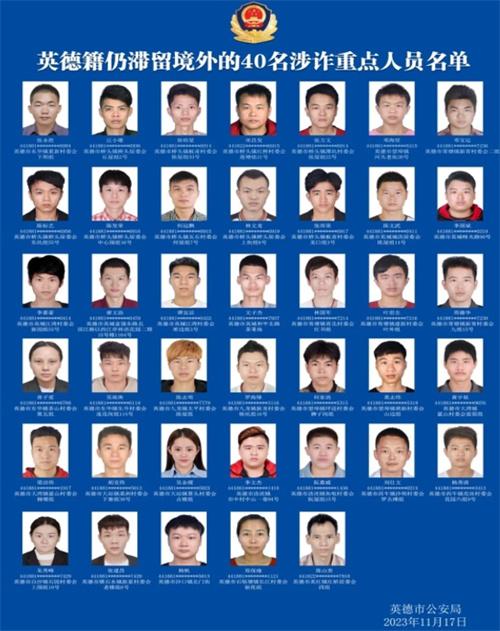 在北京時間的11月17日,清遠英德市的公安局對外發(fā)布了一條通告,這條公告里面當?shù)毓簿制毓饬藴粼诰惩馍嫦釉p騙人員目前還有40名,同時還將這40名涉嫌詐騙人員的照片對外進行了曝光。除此之外,還要求這40名涉嫌詐騙的人員,必須在限定的期限返回國內(nèi),限定的期限則為北京時間的12月15日。