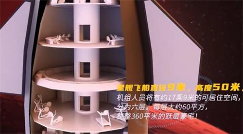 根據模擬出來的星艦內部構造可以看到就仿佛一座高達6層的太空豪宅,第1層的位置在燃料罐的正上方,第2層的位置很可能是用來儲存或者是一間實驗室,第3層則是用來健身和盥洗室專為長時間失重狀態而設計出來的。第4層的位置主要是用來星艦內部機組人員的臥室,能夠讓人們適應不同旅行需求。第5層顯示是一個豪華餐廳也是為宇航員能夠欣賞星空所提供的一個場所。最頂層也是第6層是一個駕駛室專為星艦船只狀態監控以及導航控制而設立的,這一座非常豪華的太空豪宅不光擁有非常舒適的居住空間,在內部還添加了各種生活設施,能夠給宇航員提供百分百的保障。