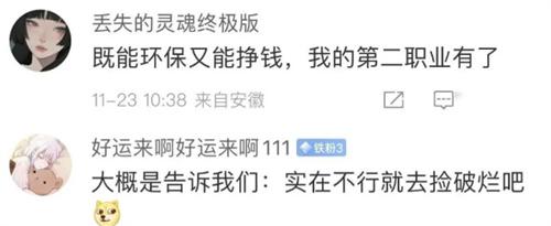 該視頻發(fā)布之后徹底在網(wǎng)上引起熱烈討論。有些網(wǎng)友開玩笑說要加入到大爺大媽的隊(duì)伍,既能夠環(huán)保還能夠掙到比自己工作多的錢我的第二職業(yè)有,另外,有一些網(wǎng)友表示,這個(gè)視頻大概是在告訴我們工作實(shí)在不行的話就去撿破爛。但是有一些網(wǎng)友表示,太難了小區(qū)的競(jìng)爭(zhēng)對(duì)手太多,我們小區(qū)阿姨都在搶紙箱。其次,有網(wǎng)友表示,撿破爛的大戰(zhàn)一觸即發(fā)晚一分鐘這個(gè)紙箱就沒了,我雙11期間總共拆了二十幾個(gè)箱子,當(dāng)我把他們?nèi)咳舆M(jìn)垃圾桶的時(shí)候,我知道可能會(huì)有一場(chǎng)搶紙箱的大戰(zhàn)就要發(fā)生。