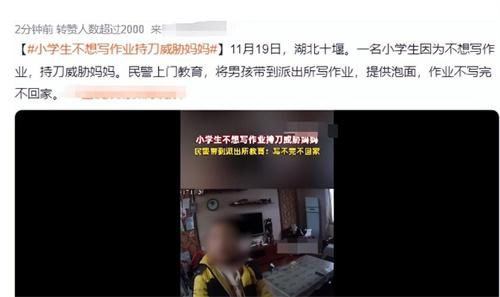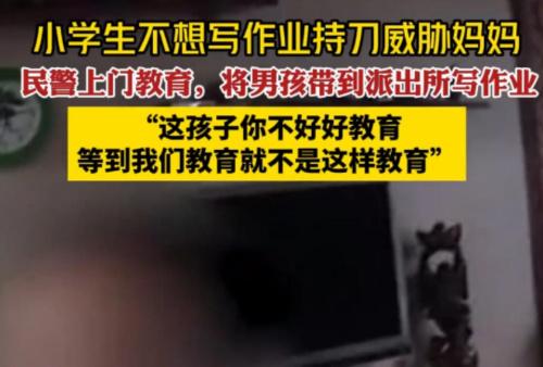 11月19日,湖北省十堰市的一名小學生因為不想寫作業持刀威脅自己的媽媽,民警接到報警電話之后配合孩子母親將這名小學生帶到派出所進行教育,這起事件在網上曝光之后,引起了很多網友的關注。一些網友紛紛在網上發表了自己的看法,有網友表示,這個孩子動不動就拿刀威脅別人真的十分可怕,因為不想寫作業竟然拿刀威脅自己的媽媽。誰知道以后會不會做出更加出格的事情。