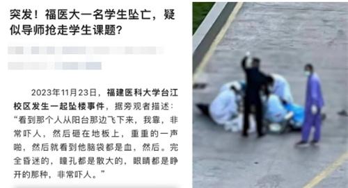 網(wǎng)傳11月23日福建醫(yī)科大學(xué)一名研究生墜樓身亡。校方對此事進(jìn)行回應(yīng),稱確實(shí)發(fā)生學(xué)生墜亡事件,學(xué)生墜落的原因,目前正在進(jìn)行調(diào)查當(dāng)中。