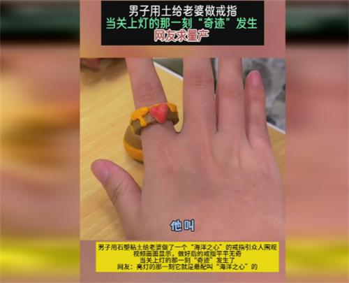11月22日,一位男子用石塑粘土給自己的妻子制作了一個非常別致的戒指,這個戒指的形狀像海洋之星,他的妻子也因為這個可愛的小禮物感到十分的開心,這件事情在網上傳開后引起了很多網友的熱議。有網友在網上調侃稱,這恐怕就是窮人的浪漫吧,這句調侃其實話里話外透露出眾多網友對這位男子的贊許,網友們并沒有因為這個戒指的簡陋而嘲笑,反而是對這個戒指大肆贊揚,還有網友在視頻下高呼求量產。