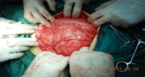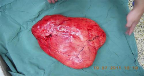 王柳是在11月中旬進行手術(shù),由剖腹探查、腹膜后巨大腫瘤切除,降結(jié)腸部分切除吻合術(shù)等進行的手術(shù),由錢鋒教授主刀,表示不能破壞附近的血管,腫瘤上面有脾臟、前面就是胃,旁邊就是結(jié)腸,下面是膀胱,也就是說整個包裹在一起,有可能威脅生命。最終4個小時的手術(shù),整個腫瘤都被成功的切下,包裹非常的好,手術(shù)之后整個腫瘤達到46斤。保留腹腔內(nèi)重大器官,沒有損傷腹腔內(nèi)任何一條重要的血管。