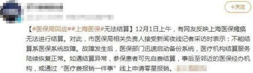 12月1日上午,有網友反映稱,上海醫(yī)保系統(tǒng)癱瘓無法正常進行醫(yī)保結算,針對此事,上海市醫(yī)保局相關負責人在接受記者采訪的時候表示,不能結算是醫(yī)保系統(tǒng)出現(xiàn)了故障,這一次故障發(fā)生之后,醫(yī)保部門迅速啟動了備份系統(tǒng),目前醫(yī)療機構的結算服務已經開始恢復正常。如果市民遇到了結算異常,參保患者可以通過自費結算的方式先行結算,事后到臨近的醫(yī)保經辦機構申請零星報銷。