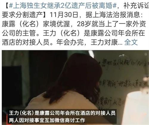 媒體將該案件曝光之后11月30號晚上話題詞#上海獨生女繼承2億遺產(chǎn)后被離婚#一度沖上了微博熱搜第一的位置引發(fā)了網(wǎng)友的熱議。據(jù)悉康露是上海人家境優(yōu)渥,28歲的時候就憑借自己的能力當(dāng)上了一家外資公司的主管,丈夫王力是康露公司年會所在酒店的對接人員。雙方認識之后王力就開始對康露展開了瘋狂追求,半年之后康露就接受了王力的求婚,婚后的王力仍然像婚前一樣對康露體貼入微,婚后半年康露的父母在一場車禍中雙雙去世,王力協(xié)助康露處理好了岳父岳母的喪事,就在康露準(zhǔn)備以新的面貌迎接生活時突然間接到了法院寄來的傳票。