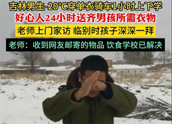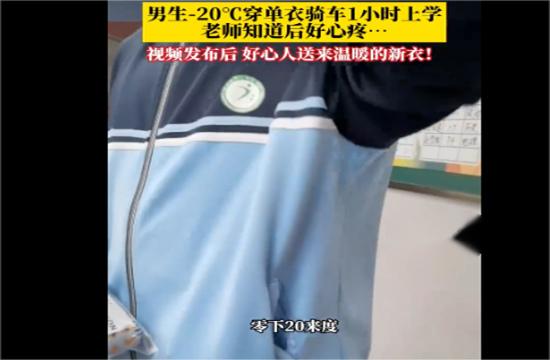 根據重慶廣電-第1眼最新報道在11月24號,一名吉林老師發布了一則男孩零下20度穿單衣騎車一小時上學回家的視頻引發了全網關注。根據老師發布的視頻可以看到老師問到你就穿這樣的衣服回家嗎,男孩說是隨后老師就把他的圍脖給男孩圍上。男孩向老師表示了感謝該名老師的視頻一經發布之后第2天就有熱心的市民給男孩送來羽絨服,男孩也鞠躬向熱心的網友表示感謝。
