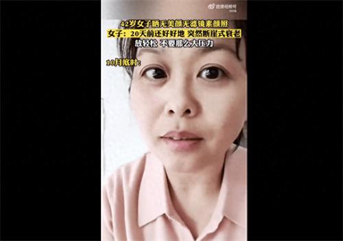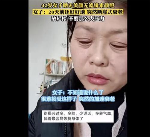 近日,一位居住在山東的女子在網絡上發布了一段自己20天斷崖式衰老的視頻。女子在視頻里面稱自己今年才剛剛42歲,但是在最近這20天的時間里面,自己卻親身經歷了一場斷崖式的衰老。女子在視頻里面表示自己衰老的速度是很多人都無法想象的,這女子不僅發布了一張自己現如今的照片,發了一張20天之前的照片,從兩張照片內可以清晰的看到這位女子。現如今臉上的皺紋不僅快速的增長,就連女子的眼神看起來都萬分的憔悴不堪,兩張照片在進行對比時會發現,現在的她與20天之前的他相對比的話就猶如就是天壤之別一樣。