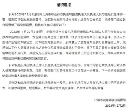12月2日,北海市銀海區(qū)聯(lián)合調(diào)查組,針對(duì)北海市綜合行政執(zhí)法局銀灘執(zhí)法大隊(duì)執(zhí)法人員與攤販發(fā)生沖突一事發(fā)布情況通報(bào),銀海區(qū)黨委政府對(duì)此事高度重視,聯(lián)合北海市綜合行政執(zhí)法局,紀(jì)檢部門以及公安機(jī)關(guān)成立聯(lián)合調(diào)查組,對(duì)此事展開全面的調(diào)查。經(jīng)過調(diào)查了解得知,2023年11月20日21時(shí)左右,北海市綜合行政執(zhí)法局銀灘執(zhí)法大隊(duì)執(zhí)法人員,在當(dāng)?shù)亟鸷0洞蟮揽叼B(yǎng)學(xué)院路段巡邏時(shí)發(fā)現(xiàn),個(gè)人攤販胡某違規(guī)占道經(jīng)營。經(jīng)過執(zhí)法人員的多次勸導(dǎo)后,攤販胡某仍舊是不服管理,執(zhí)法人員當(dāng)即作出暫扣胡某車輛的決定。