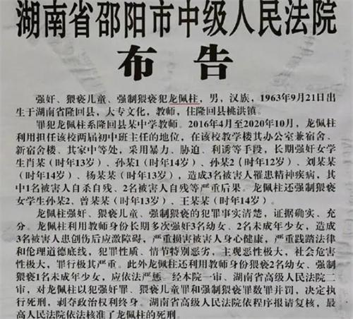初中教師龍佩柱因長期強奸5名女學生被湖南省邵陽市中級人民法院判處死刑,并且于12月1日當天執行。