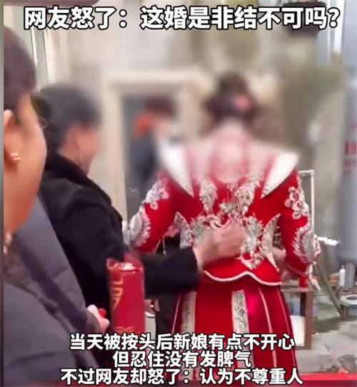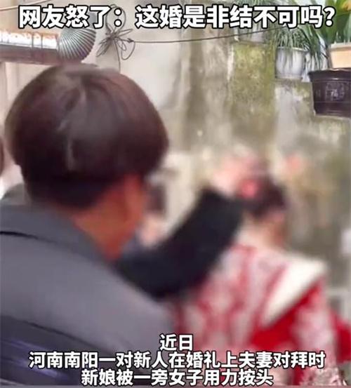北京時間12月5日在社交平臺上面出現了一則消息,引發了網友的關注和討論。一對新人在結婚的時候,新人在進行夫妻對拜的這一個儀式的時候,新娘卻被一名女子用力按頭,這一個舉動讓這一對新人也是感到非常的不滿意。這個婚禮的舉辦地點是在河南南陽,值得一提的是,這名按頭的女子并沒有覺得自己的行為有任何的不妥,他似乎覺得自己做的非常的正確。