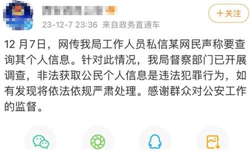 12月7日晚,陜西西安閻良公安局發(fā)布通報(bào)稱,網(wǎng)上有消息說該局工作人員私信某網(wǎng)友聲稱要調(diào)查對方的個人信息,針對這一消息該局督察部門目前已經(jīng)展開調(diào)查。根據(jù)此前網(wǎng)友發(fā)布的帖子顯示,這位網(wǎng)友接到一位女士的私信,對方聲稱可以查詢到他的個人信息,包括開房記錄在內(nèi)的各種隱私信息都能查取。這位網(wǎng)友還表示,此次威脅自己的這位女士疑似是陜西公職人員,因?yàn)樵谒奈⒉┲袝癯隽丝崴凭柕拿坪图缯隆?/p>