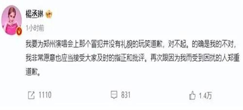 12月9日,歌手楊丞琳在鄭州開設演唱會,在演唱會中開玩笑稱河南人特別愛騙人這一句言論也引發了網友的熱議,12月10號楊丞琳通過微博發文致歉。在微博中楊丞琳寫道,我要為自己在鄭州演唱會上的那個冒犯并且沒有禮貌的玩笑道歉,對不起的確是我的不對,我愿意也接受大家的指正和批評。再一次跟因為我而受到困擾的人鄭重道歉。
