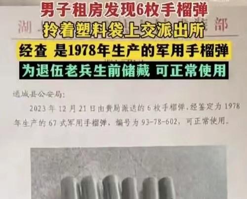 12月26日湖北通城一名男子租房時(shí)整理車庫意外發(fā)現(xiàn)了6枚手榴彈,趕緊將手榴彈上交到派出所。經(jīng)公安機(jī)關(guān)核實(shí),這6枚手榴彈是可以正常使用的,并且是1978年生產(chǎn)67式軍用手榴彈,手榴彈是退伍老兵留下的,屬于軍用物資,老兵已經(jīng)去世多年。