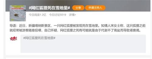 北京時間12月26日,在今天微博上出現(xiàn)了一個詞條引發(fā)了網(wǎng)友的關注,詞條當中的內(nèi)容寫的是網(wǎng)紅狐貍死在了雪地里。據(jù)了解,在新疆阿勒泰喀納斯景區(qū)有一位游客發(fā)布視頻稱網(wǎng)紅狐貍死亡,從視頻當中可以看得出有一只狐貍躺在雪地里面一動也不動的,周圍還有很多的腳印。當事人表示自己拍攝的地點是在布爾津的路上,這只狐貍是躺在了半山腰的位置。