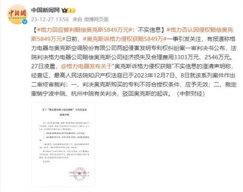 格力電器官方在12月27日凌晨發(fā)布聲明表示格力賠償奧克斯5849萬元是虛假消息,格力與奧克斯是競爭對手的關(guān)系,糾紛已久,格力電器還在2019年6月舉報奧克斯生產(chǎn)、銷售不合格的空調(diào)產(chǎn)品。格力電器在聲明中表示,公司注意到近日網(wǎng)絡(luò)中流傳“奧克斯起訴格力侵權(quán)獲賠5849萬”的信息,該消息屬于不實信息,并且部分媒體與平臺未盡核實義務(wù)已經(jīng)侵害公司合法權(quán)益,請相關(guān)信息發(fā)布媒體和平臺及時澄清,消除不良影響。