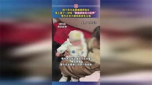 1月5日,一名4個月大的女嬰被遺棄在了四川省達州市宣漢縣,女嬰身上還有一張紙條上面寫著出生日期與遺棄原因,這個女嬰是因家庭變故無力撫養(yǎng)才被遺棄的,目前警方已經(jīng)將女嬰送到了福利院。這個孩子出生于2023年8月20日,警方將女嬰送到福利院后也在關(guān)注后續(xù)情況,孩子的身體情況也要等待福利院檢測后才能知道,這個女嬰身上放著紙條,有著明顯的遺棄意圖,丟棄孩子的地方也沒有監(jiān)控。警方正在全力尋找這位女孩的親生父母,有一位民警表示無法找到女孩的親生父母,很有可能就會被領(lǐng)養(yǎng)。