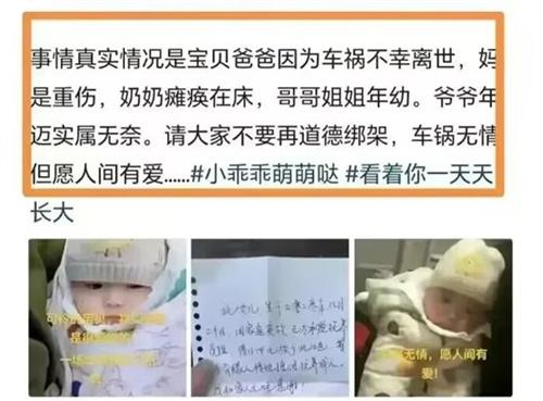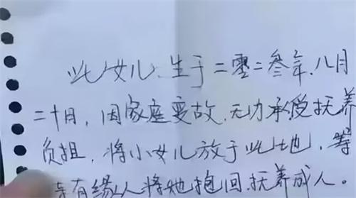 1月5日,一名女嬰被遺棄在四川達(dá)州宣漢縣城的街頭,被居民發(fā)現(xiàn)后聯(lián)系警方處理,在社交媒體當(dāng)中,有人稱這名女嬰是由于父母離世,爺爺奶奶無力撫養(yǎng)才被遺棄。警方隨后辟謠,只是還沒有找到父母,并不能夠說明其父母雙亡。這名女嬰在被撿到之后,他的身上有一張紙條,紙條上的內(nèi)容為:女嬰出生于2023年8月20日,因家庭變故,無力撫養(yǎng),將小女兒放在此地,等待有緣人抱回?fù)狃B(yǎng)成人。