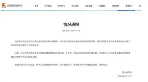 這起事件在社交平臺(tái)上發(fā)布之后已引得官方注意。山東省紀(jì)委監(jiān)委會(huì)同山東黃金集團(tuán)成立調(diào)查組,對(duì)反映的事實(shí)進(jìn)行核實(shí),發(fā)現(xiàn)王立軍確實(shí)存在違反中央八項(xiàng)規(guī)定精神和廉潔紀(jì)律問題,王立軍,張某存在生活紀(jì)律和作風(fēng)問題,但并未發(fā)現(xiàn)兩人在山東黃金集團(tuán)并購(gòu)銀泰黃金過程中存在違規(guī)違約問題。