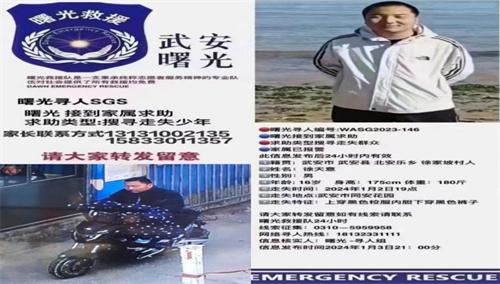 截止到目前孩子的媽媽非常擔心,失蹤的男孩名叫徐天意,在1月2日晚上7點左右騎車離家,之后與家人失去聯系,1月3日凌晨,徐天意家長和班主任楊老師聯系,希望楊老師幫忙一起尋找孩子。通過公安和救援隊的協助尋找,徐天意的電動車以及鑰匙在洺湖發現,曙光救援隊,藍天救援隊以及公安機關都在全力的尋找。家長表示不了解徐天意為什么會離家,徐天意的媽媽一直失眠,幾天也沒有吃下東西。