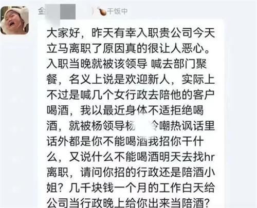事情發(fā)酵到如此地步,南京人社局的工作人員也明確表示對此事件非常關(guān)注,相關(guān)部門已介入調(diào)查,查看該公司是否存在強(qiáng)制員工陪酒的違法現(xiàn)象,一旦發(fā)現(xiàn),一定會嚴(yán)肅處理,維護(hù)廣大員工的權(quán)益。