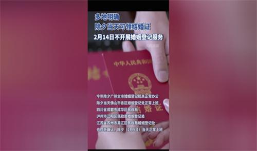 近日,全國(guó)多處民政局部門對(duì)婚姻登記服務(wù)進(jìn)行了調(diào)整,規(guī)定除夕當(dāng)天將開放婚姻登記服務(wù),但是2月14日國(guó)際情人節(jié)不提供此項(xiàng)服務(wù),措施的調(diào)整目的在于確?;橐龅怯浌ぷ饔行蜻M(jìn)行,也為廣大市民提供便利的服務(wù)。