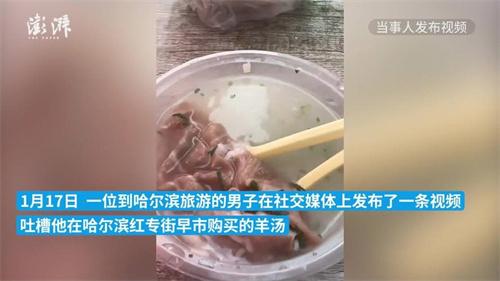 2024年1月17日,一名男子在哈爾濱早市購買20元的羊湯僅有五片肉卷,這個物價引發了男子的不滿,隨即在網絡上吐槽該店鋪。在1月20日,哈爾濱回應,已經取消該攤主的經營資格。