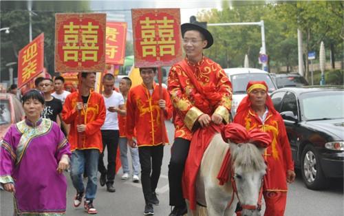 這場大雪也讓婚禮極其難忘,實際上新郎本身打算用婚車接送,但不料天氣突然下起大雪。新郎在出發之前有很復雜的步驟:新人在出發前首先要沐浴更衣,穿著整齊的服飾,佩戴合適的配飾。新郎身著中國傳統服飾胸前佩戴胸花表示隆重和喜悅的心情,步行出發前去接新娘的過程中,迎親和送親的隊伍相遇,整體美景美不勝收。