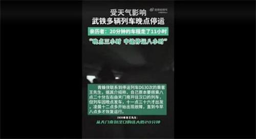 對此情況,武漢鐵路的官方稱是受到了低溫雨雪冰凍天氣的影響,導致漢宜線漢川至大福段發生供電網停電的故障,影響包括D630次在內的多趟列車的晚點,面對雨雪天氣,人們的力量也是很弱小的,只有等待,記者也觀察到有多名網友在深夜發文表示D630次列車半路停運被困在車上,同時有些網友還稱列車上的人冷的受不了。