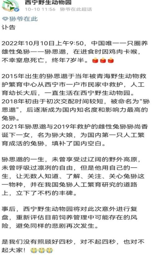 10月10日在西寧野生動物園發(fā)布了一個訃告,內(nèi)容表示在上午9:50的時候,唯一一只被圈養(yǎng)的雄性兔猻“猻思邈”,因為在吃飯的時候被雞肉卡住了喉嚨,所以導致了窒息,終年7歲半,不幸離世。