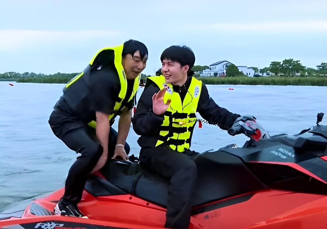 在水上不斷的漂移,完全忘記身為導演的王晨晨還在自己的身后,看王一博在摩托艇上瀟灑的樣子,這簡直十分帥氣,導演在他身后直接一個漂移被甩到了水里。