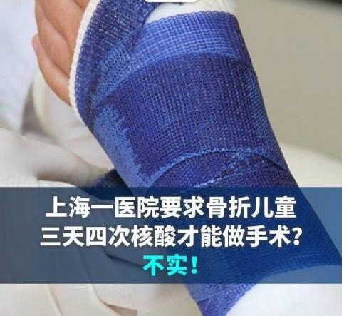 前幾天微信圈爆出一段聊天記錄,稱同事的女兒由于玩輪滑,摔斷了手臂,到醫(yī)院做手術(shù),醫(yī)院卻要求骨折兒童在三天之內(nèi)做4次核酸,只有全部陰性才會給做手術(shù)。而孩子在手臂完全斷裂的情況下,硬是扛了兩天兩夜。而且還爆料稱這件事就發(fā)生在上海兒童醫(yī)院,醫(yī)院位于萬源路上。經(jīng)過多方求證,上海辟謠平臺已經(jīng)發(fā)布這條信息系謠傳是不實信息。