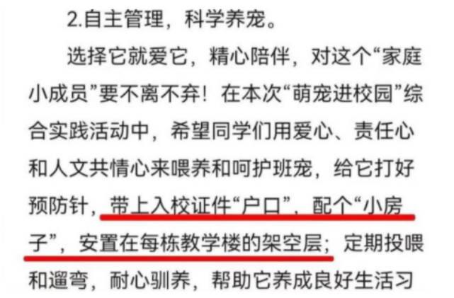 按照學校的要求學生要帶寵物進學校就需要打全預防針,還要帶上入校證件,并要為自己的小狗配備一個專門的小房子,小狗不得進入教學樓和宿舍等區域,需要安置在每棟教學樓的架空層內,對此記者采訪了南寧二中高中部政教處,工作人員表示情況屬實,但由于剛開學,并沒有學生申請,現在校方正在穩步的推進并實施此事,之后還向記者說,關于寵物進校園是學生們組織發起的,說是這樣,可以讓學生在忙碌的學習中適當的放松一下身心,這項規定目前領導也是支持的。