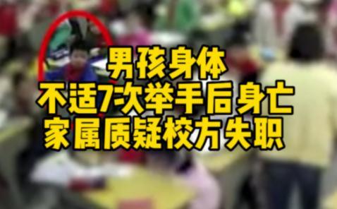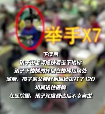 自己才8歲的兒子郭某在上課期間,由于身體不適在10分鐘內7次舉手示意,提前任課老師沒有做出過多的回應,直到下課之后男孩才有老師帶領著下樓梯,在下樓梯至拐角處時摔倒,最后老師通知了男孩家屬,其父親在趕到現場后,立即撥打了120將男孩送往醫院接受救治,最終男孩還是不幸身亡。