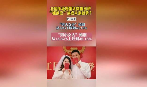 江蘇2022年婚姻大數據:婚姻登記量連續5年下降,姐弟戀超兩成 根據今日江蘇常州,揚州,浙江杭州等地民政局所公布的2022年度婚姻大數據顯示婚姻登記量已經連續5年下降,江蘇四地平均結婚登記的年齡均超過30歲,姐弟戀的比例持續上升。進行婚姻登記的女性年齡比男性年齡大1~4周歲的占22.66%,占比第二,這一數據基本以2021年持平。男大女小的組合仍然是當前辦理結婚登記的主流,根據所公布的2022年全省辦理結婚登記,男女年齡差可以看出男性的年齡比女性大1~4周歲的占比例最多,達到43.03%。